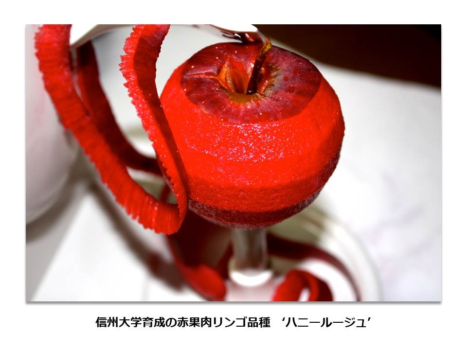 - 種々の赤果肉リンゴ品種を育種するとともに、栽培普及・量産化し、加工・利用について製品化を提案する。