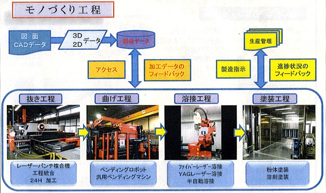 パンチレーザー複合加工機による工程統合 人とロボットによる最適な曲げ加工、ファイバーレーザーを使用した低歪な溶接、粉体塗装と溶剤塗装を使い分けて厳しい外観要求を満たすことのできる塗装。