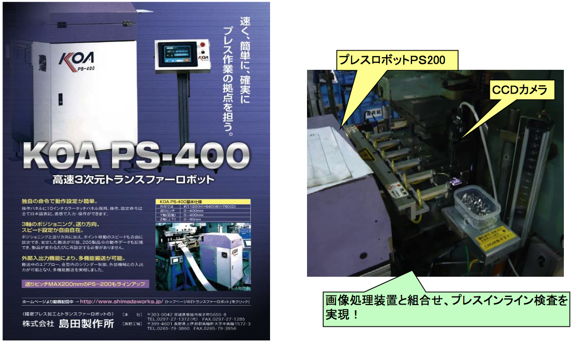 - 自社開発のロボットによるロボットプレス加工を主に、金属プレス加工製品の生産、プレス金型設計、製作、プレス搬送ロボットPSシリーズの製作、販売、プレス周辺機器等の設計製作販売を行っている。