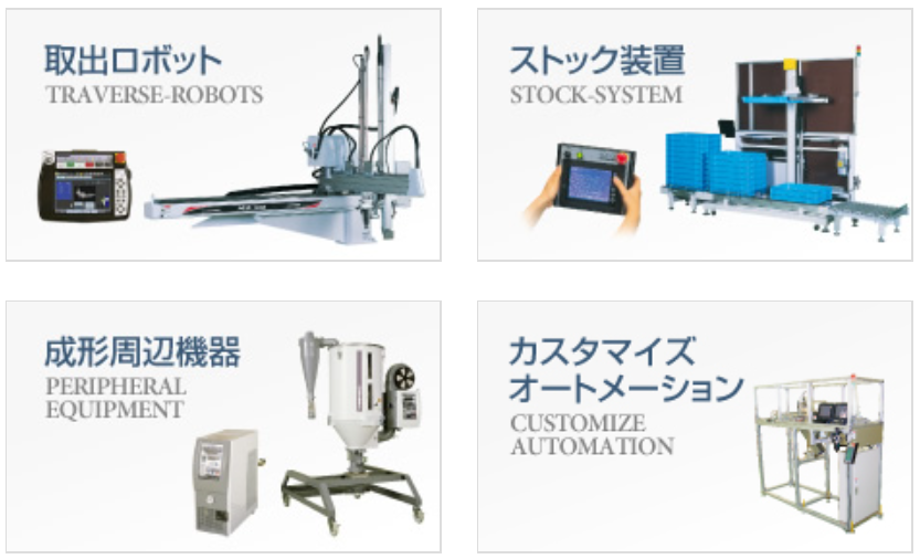 - 産業用ロボット(射出成形品自動取出装置)プラスチック成形機周辺合理化機器の開発・製造・販売