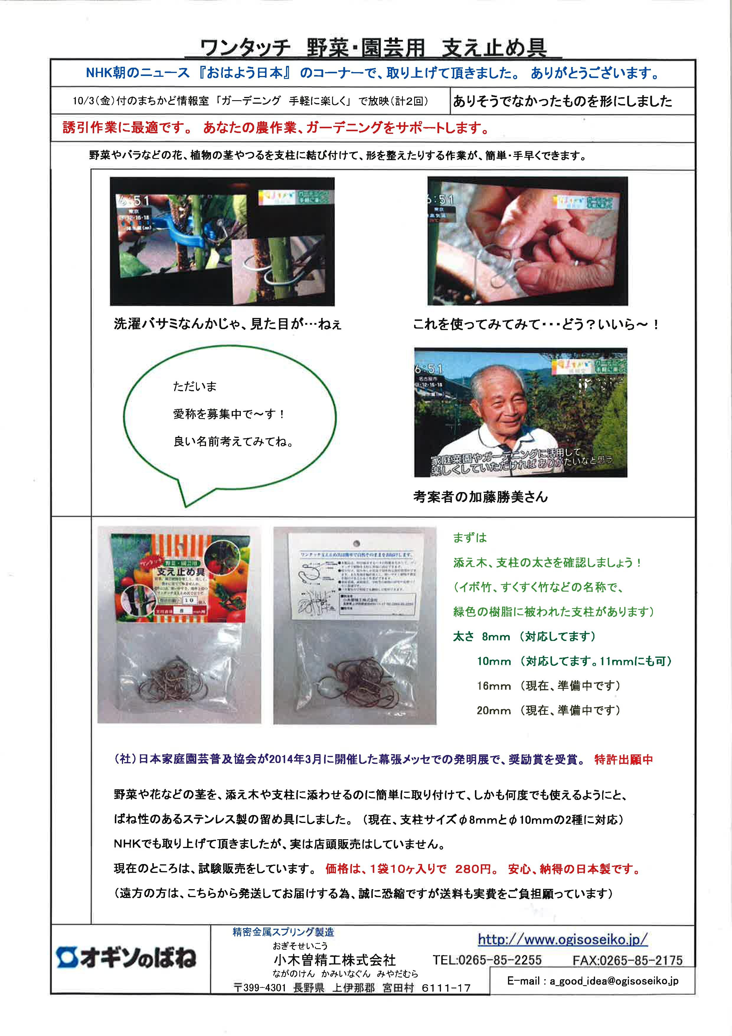 - 従来は、一つ一つを紐で縛ったり、針金で括ったりと手間・時間がかかりました。簡素を謳った(うたった)ものでも、支柱に固定するのに洗濯バサミタイプのものだと、見栄えが悪くて残念でした。